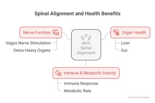 Spinal alignment enhances nerve function, particularly affecting detox-heavy organs like the liver and gut. It also stimulates the vagus nerve, which helps regulate digestion and inflammation.