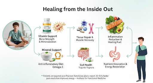 Functional medicine addresses nutrient deficiencies, inflammation, and hormonal imbalances that may slow down bone repair or increase reinjury risk.