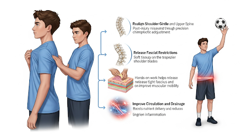 Once the bone was stable, chiropractic care stepped in to restore balance. Months of guarding the injured side had created tension, misalignment, and muscle imbalances. Chiropractic adjustments and soft tissue work helped: